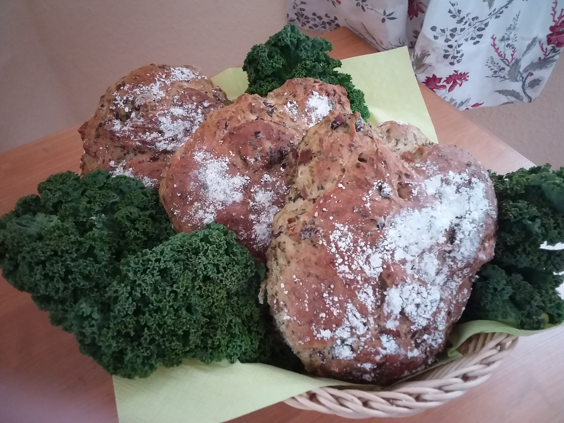 4. Ein tiefes Backblech mit Wasser füllen, auf die unterste Schiene des Ofens schieben und den Backofen auf 250°C (Umluft 230°C) vorheizen. Den Grünkohl und die Röstzwiebeln unter den Teig kneten. Den Teig zu einem runden Laib formen und auf ein mit Backpapier ausgelegtes Blech legen. Die Teigoberfläche rautenförmig ca. 1 cm tief einschneiden. Mit Mehl bestäuben und weitere 15min gehen lassen. Grünkohlbrot auf der mittleren Schiene 10min backen. Dann den Ofen auf 200°C (Umluft 180°C) zurückschalten und weitere 40 Minuten backen.