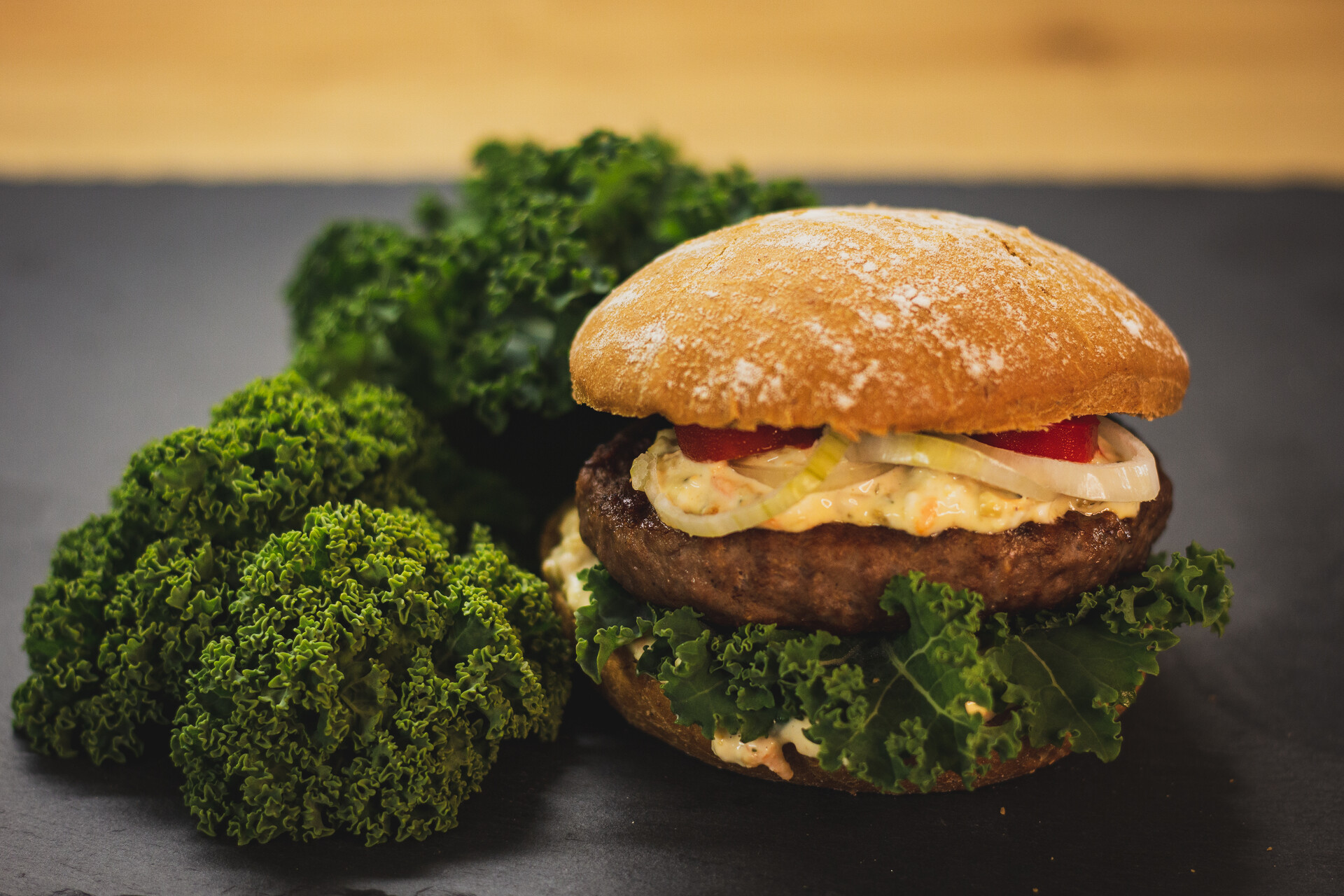 6. Inzwischen die Schnittflächen der Brötchen mit der Creme bestreichen. Den Grünkohl auf der unteren Hälfte verteilen, Patty darauflegen und mit den restlichen Zutaten schichten. Anschließend mit dem Brötchendeckel abdecken und servieren.