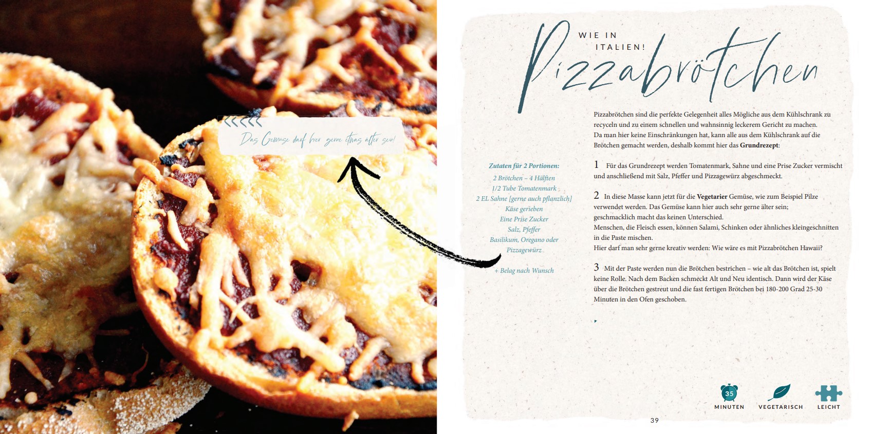 Bei den aufgeführten Gemüsesorten darf alternativ genutzt werden, was vorhanden ist. Auch schrumpeliges Gemüse kann noch gut verwendet werden. Alle Rezepte lassen sich auch mit veganen Alternativen zubereiten.